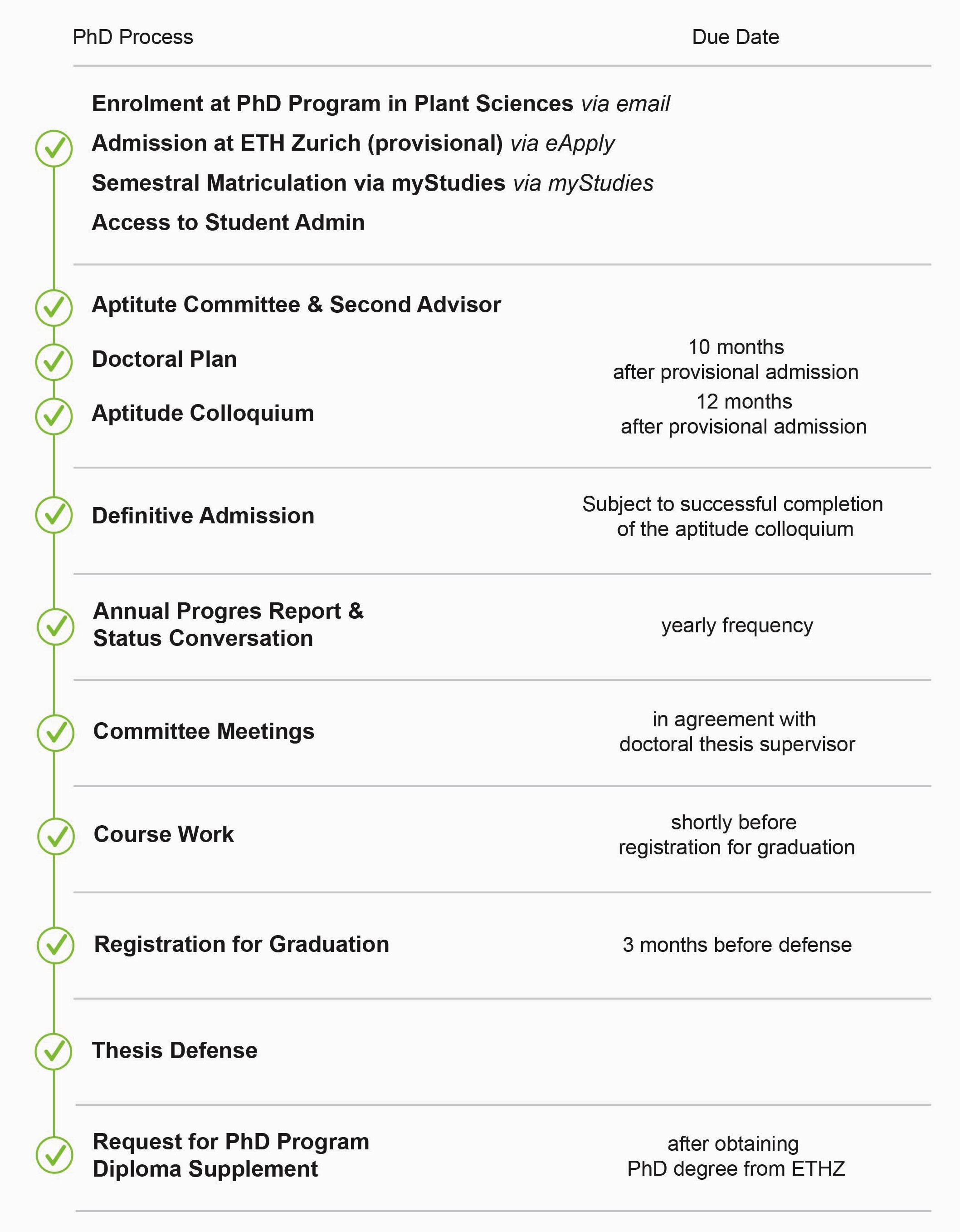 Doctoral studies at ETHZ are governed by the ETHZ Ordinance on the Doctorate and the department-specific Detailed Stipulations. The responsible department (e.g. D-BIOL or D-USYS) monitors all formal milestones of the doctoral process. The PhD Program in Plant Sciences does not assess doctoral research progress. It just documents selected milestones for quality assurance purposes within the framework of the LSZGS.